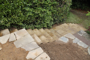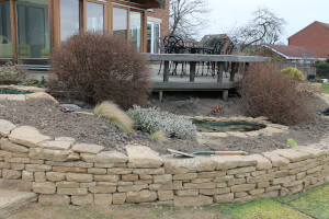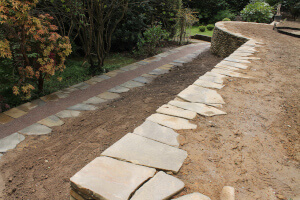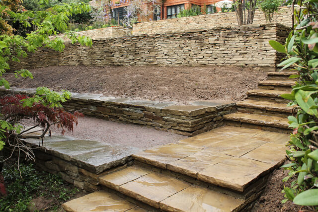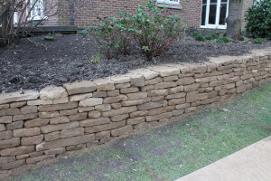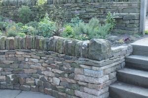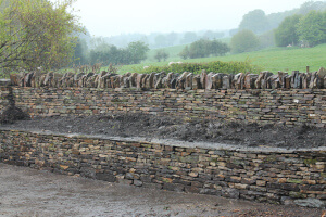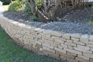 Dry stone is ideal for retaining earth banks because while it has the weight of stone to hold back tonnes of clay and soil, it is also free draining meaning that water does not get trapped behind it. When dry stone walls are built by craftsmen they are ‘tied in’ to a bank with longer stones and built with an internal batter working as a counterweight to the pressure of the bank. They can cope better with the pressure of the soil and tree roots over time because they can flex where cement walls will crack. However, with enough strenghening and drainage points banks may also be retained with reinforced blockwork and fronted with stone.