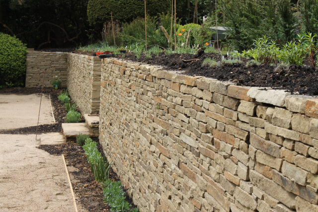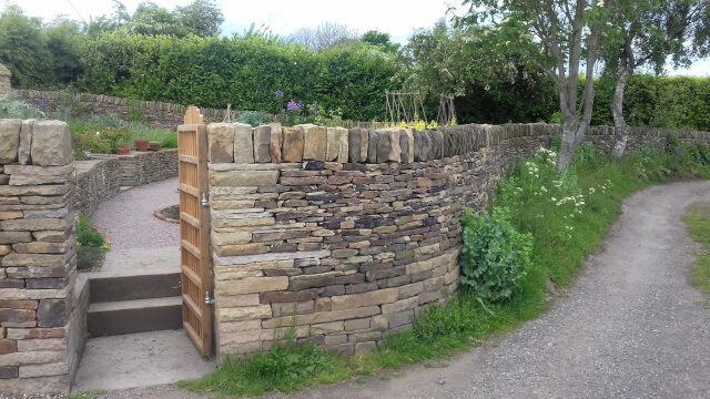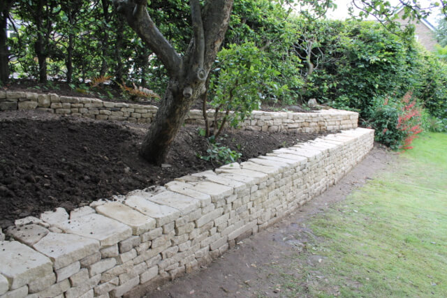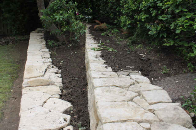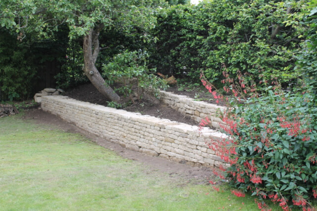 In this village garden, we replaced a rotten wooden log retained bank with two thick retaining walls built from 10 tonnes of York stone. This is a permanent solution to this raised area of the garden. Because dry stone does not need a deep foundation digging, building the wall did not damage the roots of the apple tree or the hedge to the rear.