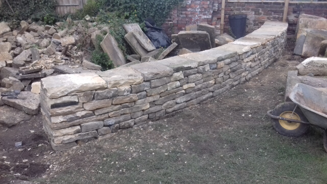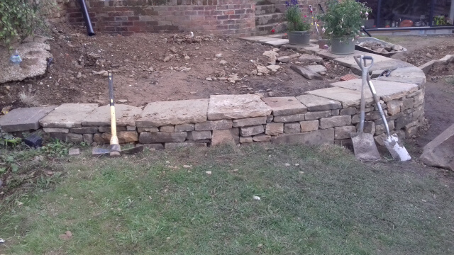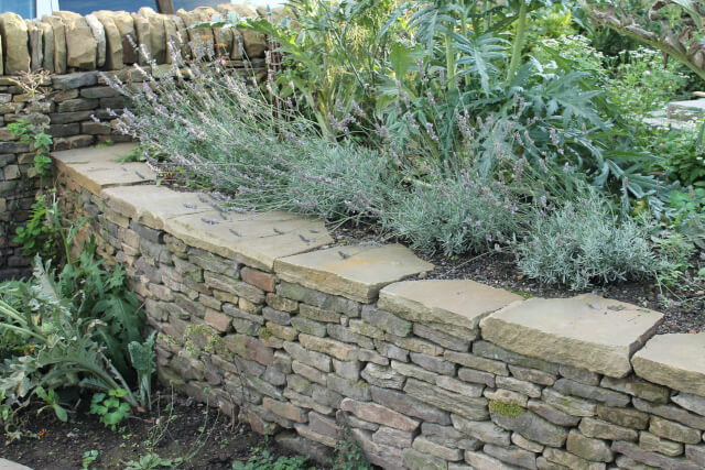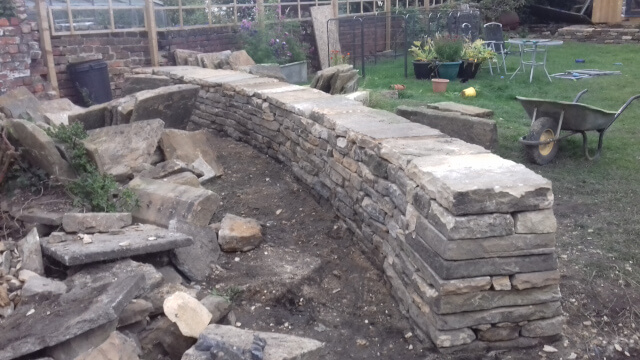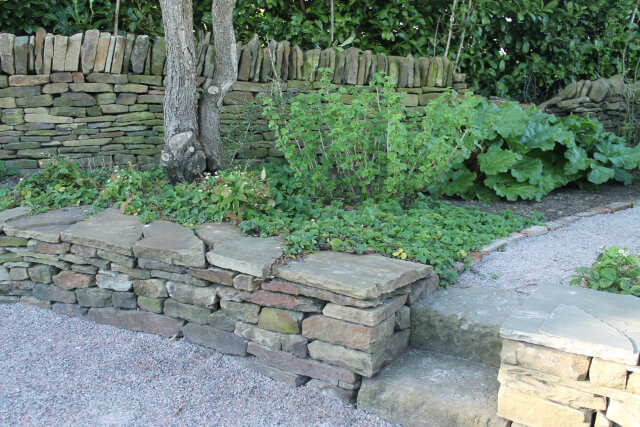 In this back garden the client had some reclaimed stone leftover from some work on the house. The thick flagstones made an excellent topping for the low curving walls which were to double up as seating areas in the garden.