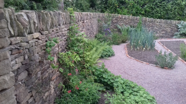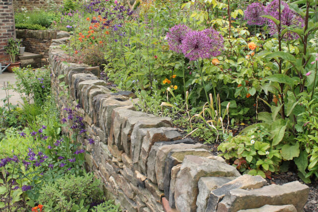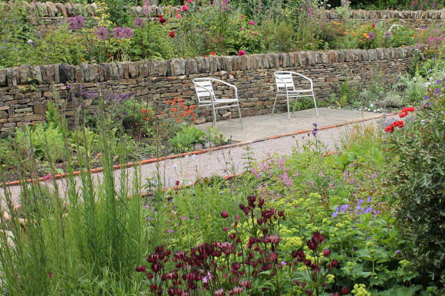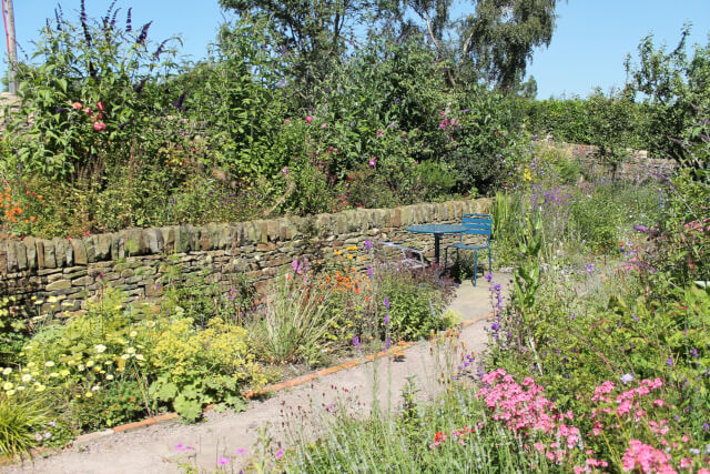 In this cottage garden, a central path gravel path is edged with reclaimed bricks and runs alongside a dry stone walled terrace area that is full of buddleias which provide an excellent screen. The large beds and close planting create an abundance of flowers and foliage throughout the year.