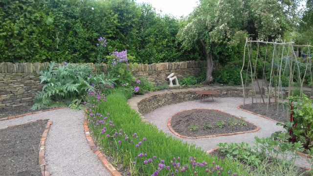 In this garden we created a multi-level effect by creating one top terrace on a higher level above a lower level. The terrace dry stone walls are lined with large lines of lavender in front of lines of chive plants. The main structure of the garden is large gravel areas with defined circular beds which reflect the curves of the walls. Dry stone walls lend themselves well to curves and this garden made the most of it. As well as being a very attractive space, it also has a productive herb garden, vegetable patches as well as many perennials like artichoke and rhubarb. In the shaded parts, under a hawthorn, are gooseberry and currant bushes. The dry stone walls also work well for climbers like hop and sweet pea.