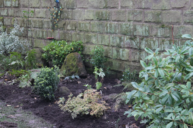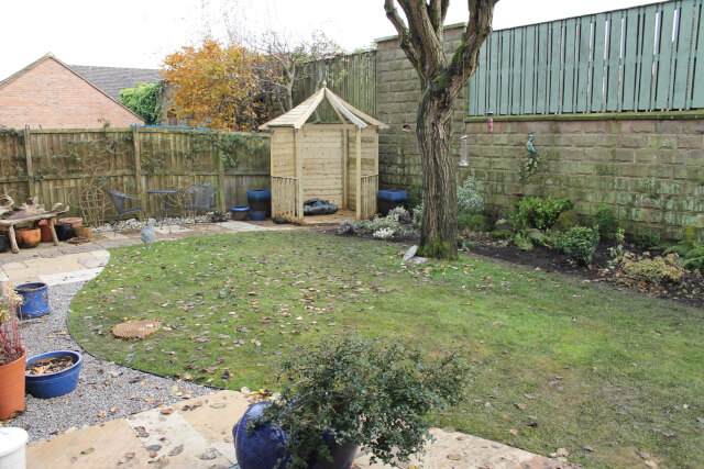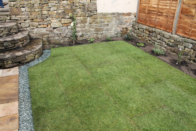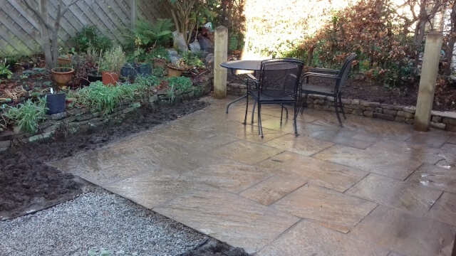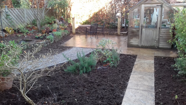 This back garden was totally transformed. It was a weed ridden uneven lawn in a back garden area with a damaged fence and a large tree stump to one corner. We created a design that would cover over the tree stump by building a stone walled raised bed. Our design also incorporated a multi-level effect by having the raised bed and the slightly raising the patio and facing it with stone. We stripped up the old lawn, flattened, added loam, weeded the area and re-lay new turf. We also replaced wind damaged fence panels, put down a stone path and put down strips of granite gravel edging.