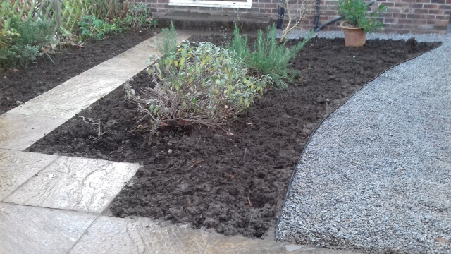 Removal of old lawn and replacement with stone patios, wide gravel paths and large beds for planting space.