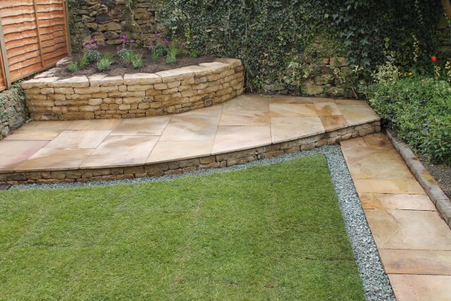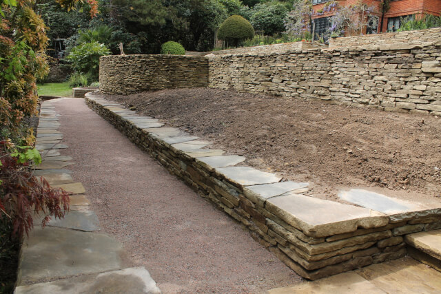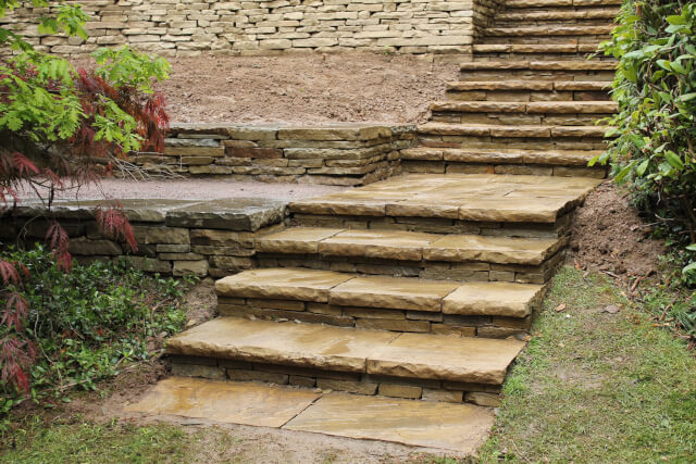 This was a project we were involved with that was fairly large scale as it required over 100 tonnes of quarried stone and riven flags. It involved creating a series of stone walled terraces interlinked by riven York stone flag staircases. It also involved completely re-doing the lawn areas. Overall, it represented a total overhaul of the space.