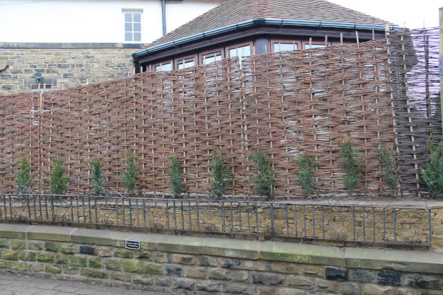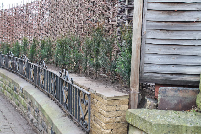 We took out a conifer hedge that was outgrowing it’s position next to an extension. We were then asked to build a small retaining wall and replant the soil bank with yew. As the yew whips will take a while to establish themselves, it was necessary to install a traditional hazel fence that would screen the house until the yew hedge have put growth on. The advantage of this type of fence is that the wind blows through the gaps and will not get damaged in gales like a panel fence may do.